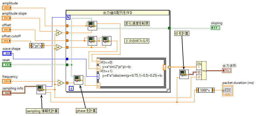 プログラミング/LabView/スニペットライブラリ#y4f95948 のデザインをサブ VI に分割して、再利用性の高い波形発振器の実装を考えます。
