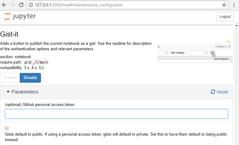 - jupyter notebook の Nbextentions タブで Gist-it にチェックを付ける
