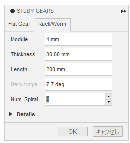 Rack/Worm タブで Num. Spiral (条数)を 1 以上にするとラックではなくウォームが生成されます。