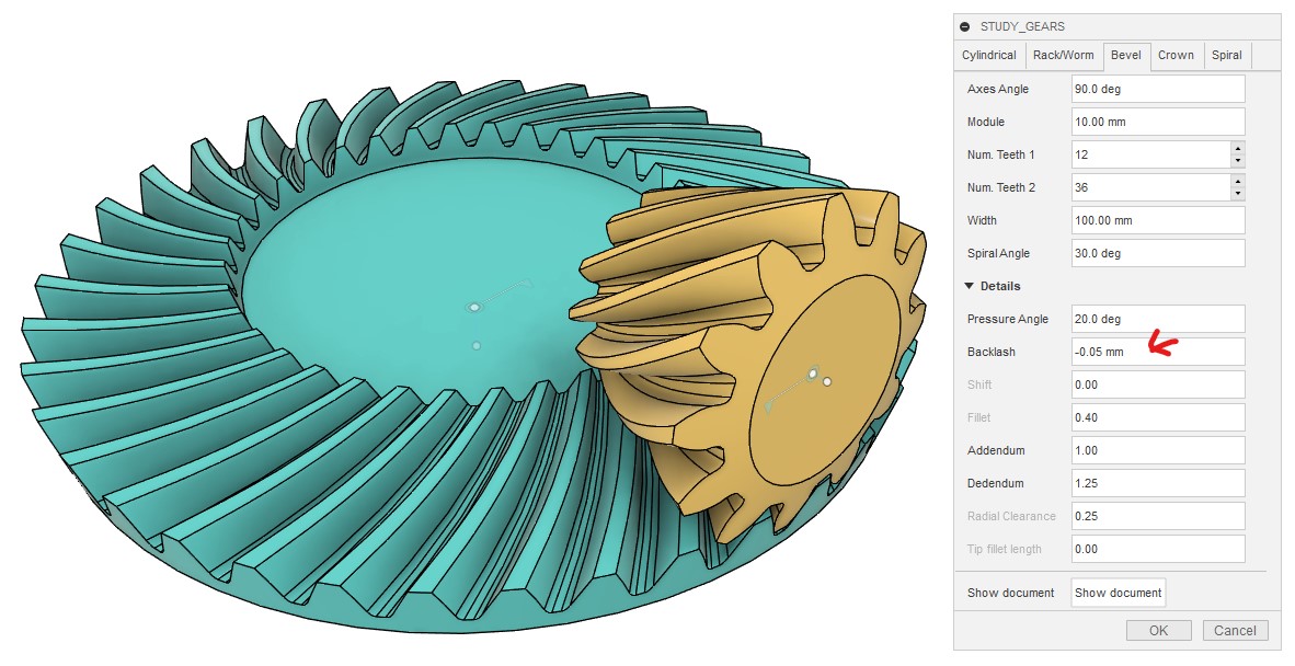 まず十分な計算精度を確保するため大きなモジュール、ここではモジュール10で歯数12と歯数36の曲がり角30度の曲がり歯かさば歯車を生成しました。軸間の角度は90度です。このときバックラッシュを -0.05 mm に設定することで2つの歯車が若干ですが干渉するようにしておきます。
