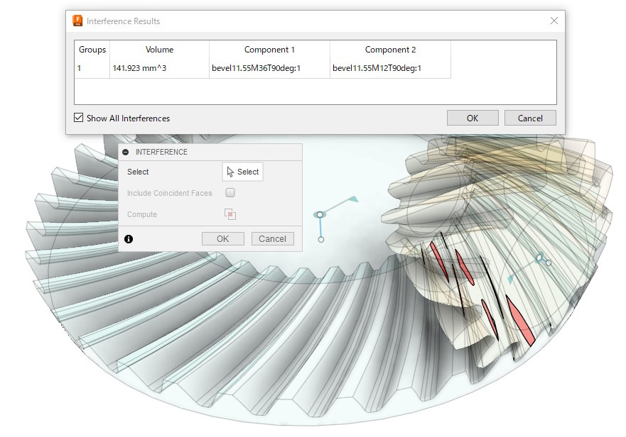 歯車の形状が悪いのかと思って慌てたのですが、どうやらこれは干渉領域の計算精度に問題があるためのようです。