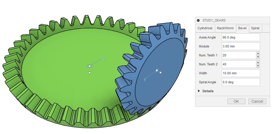 Spiral Angle に値を入れるとまがり歯のかさば歯車を作れます。