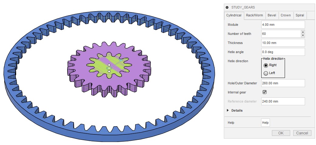 歯数 12 と 24 の平歯車、歯数 60 の内歯車を生成。厚さは 10 mm、内歯車の外径は 260 mm としました。