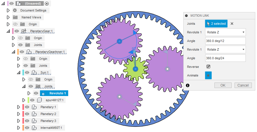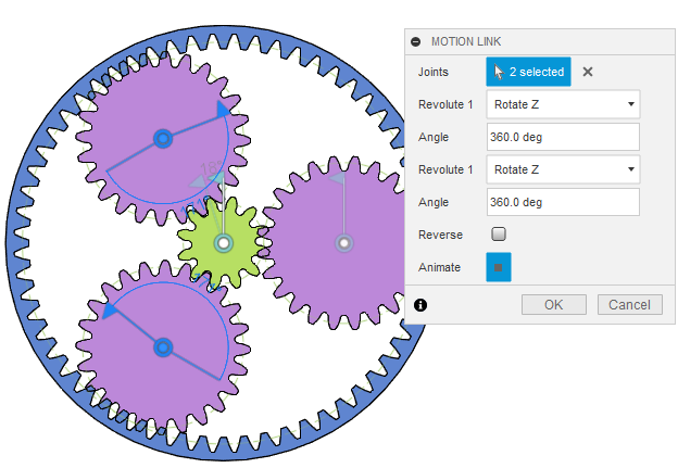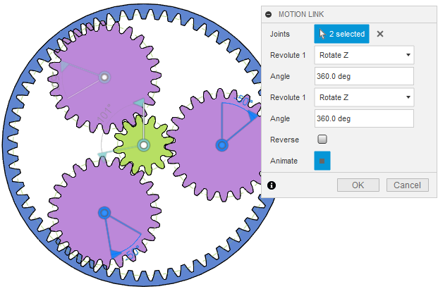 太陽歯車と左上の遊星歯車の回転軸の間にモーションリンクを作成。