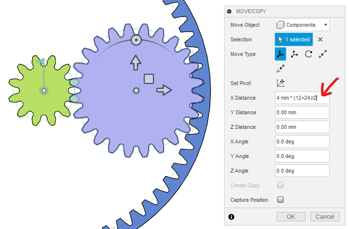 遊星歯車のコンポーネントを x 方向に 4 mm * (12+24) / 2 だけ移動します。
