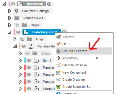 遊星歯車の軸は PlanetaryGearInner に固定されているので、 PlanetaryGearInner を右クリックして「ピン留め」することで遊星歯車を固定できます。