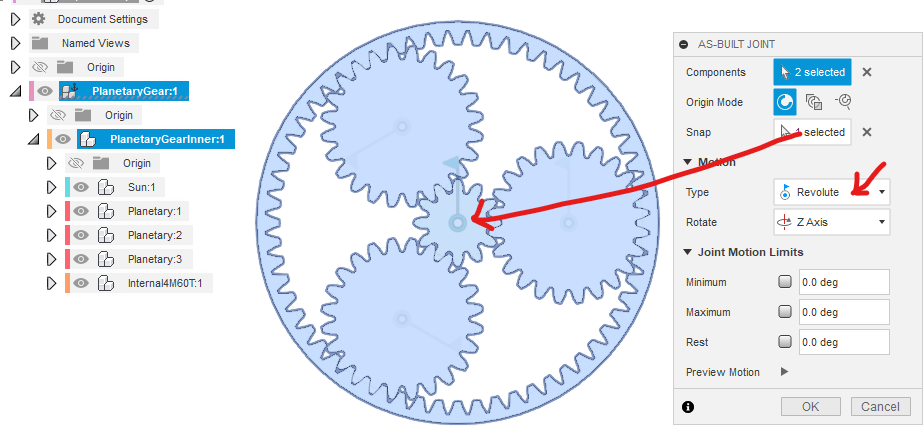 PlanetaryGear と PlanetaryGearInner との間に構築済み回転ジョイントを作成。