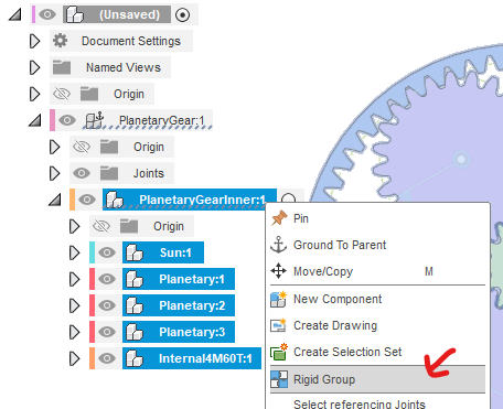 PlanetaryGearInner とその子コンポーネントを選択して、剛性グループを作成。