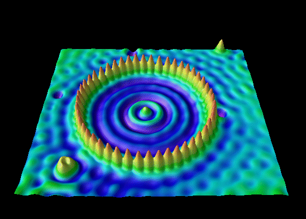 彼らは原子レベルで平坦に磨き上げた銅の表面に鉄原子をばらまいて、 それを針でつついて動かすことにより直径 12.4 nm の「囲い」を作成した。 この「囲い」は銅の表面近傍の電子に対して「エネルギー障壁」のように働くため、 囲いに入射する電子波は反射波と干渉し、その近傍で電子密度の定在波を生じる。