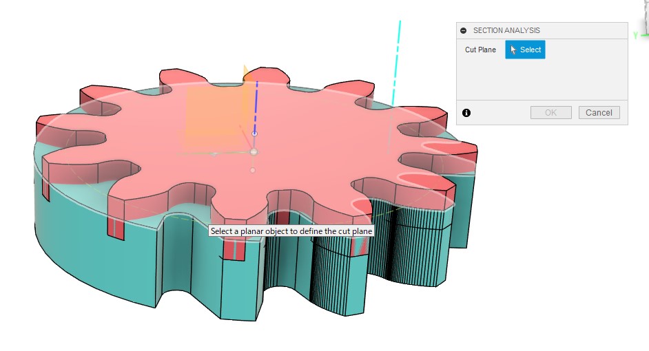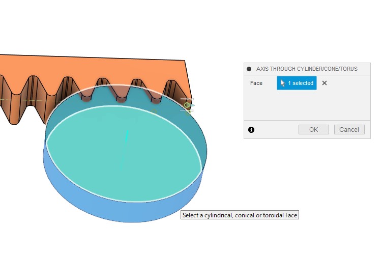 歯車の上面を基準にスケッチを作成し、歯車の中心と歯先の中点とを結ぶ三角形で正しく成形された歯溝部分を切り出します。