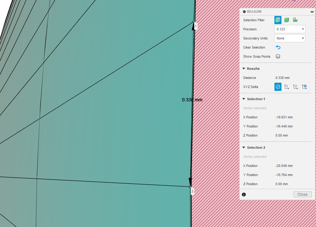 この形状は歯末の部分と歯元の部分の2つの曲線から構成されているので、 それぞれについて別々に曲面で近似して、でこぼこな表面部分を 0.01 mm だけ工作/Fusion360曲面生成スクリプト により剥ぎ取ります。