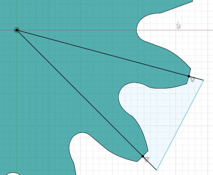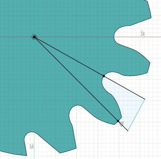 そのために歯車の一部を切り出すために作成したスケッチを開きなおして、 一方の直線を歯溝の底の中心(このときはちょっとずれてました💦)を通るように変更します。