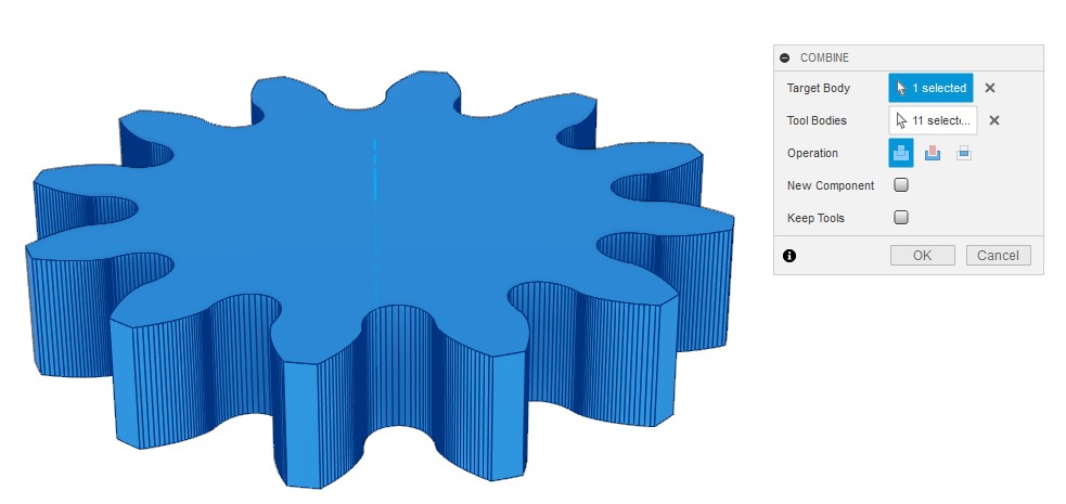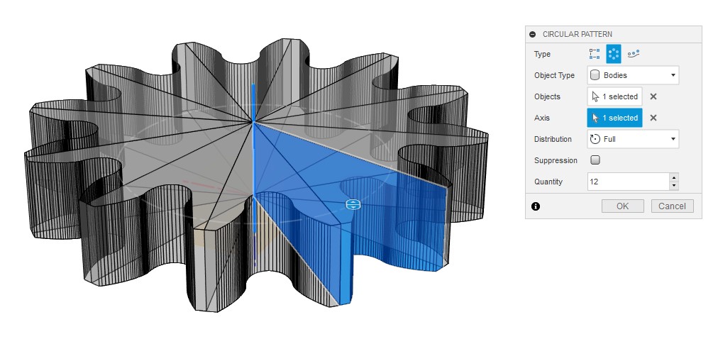 切削の行えた歯溝部分を切り出して、円周上に並べることで歯車の全体形状を作れます。