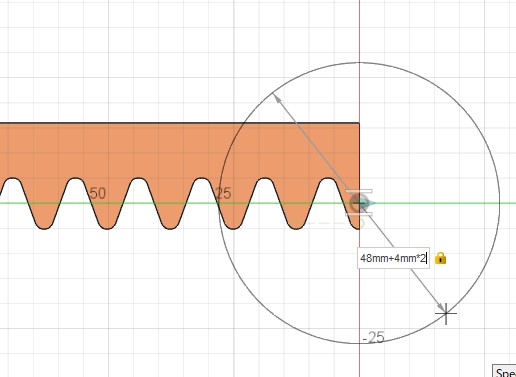 ここではモジュール4で歯数12としますので、基準円の直径は $4\times12=48$ mm で、 そこにモジュールと等しい歯末の丈を両側に加えますので、円柱の直径は $48 + 4\times 2=56$ mm となります。