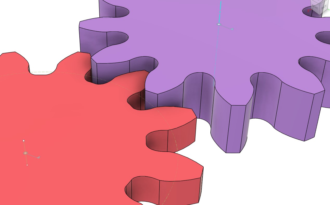 正確な形状であるピンクの歯車の表面が滑らかなのに対して、 切り出した方の歯車の表面は切り出し時のピッチあたり20ステップに対応する小さな面の集合でできていることが分かります。