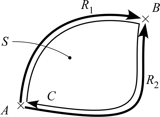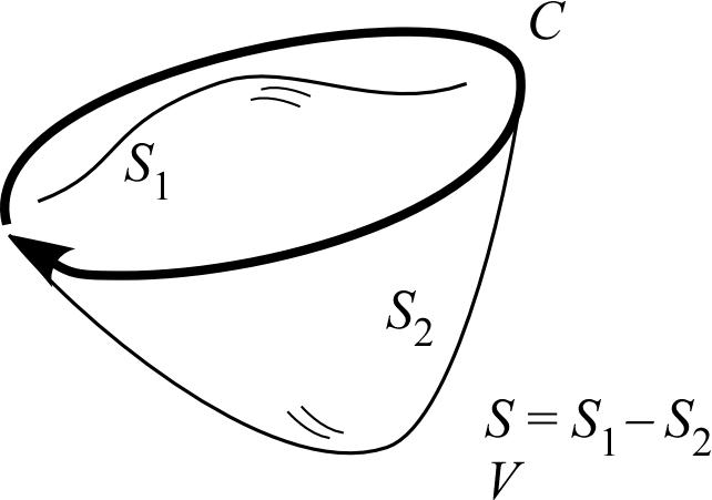 閉曲線 を考える。 を縁とする2つの曲面 を取り、それらを合わせてできる閉曲面を 、 に囲まれる体積を とする。