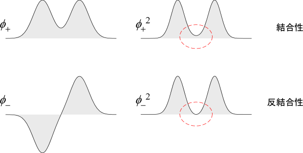 結合性軌道は反結合性軌道に比べ、両方の陽子からの引力相互作用を受ける 分子中心付近での状態密度が高いため、 $\braketm{1}{\hat H}{2}$ の分だけエネルギーが低くなっている。