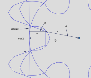$$ r=\sqrt{(r_p-m)^2+(\pi m/4-m \tan \alpha-r_p\omega t)^2} $$ $$ \theta=\text{atan}\,\frac{\pi m/4-m \tan \alpha-r_p\omega t}{r_p-m} $$ このときピニオン自体 $\omega t$ 回転しているのでピニオンと共に回転する座標では $$ \theta'=\theta-\omega t $$ となる。この曲線はトロコイド曲線と呼ばれるそうだ。
