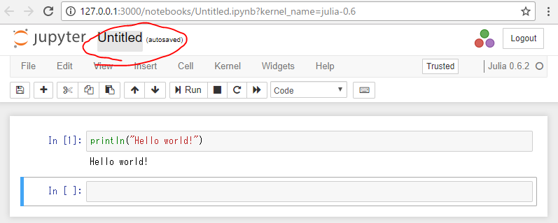 開いた画面の上部 Untitled をクリックするとノートのファイル名を変えられる。