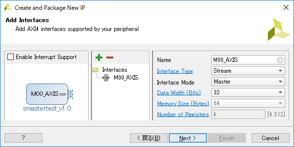 [Tools]-[Create and Package New IP...] から smastertest という IP を作り、 AXI-Stream マスターポートを持たせました。