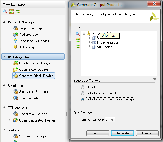 [Generate Block Design] の後、[Generate Bitstream] します。