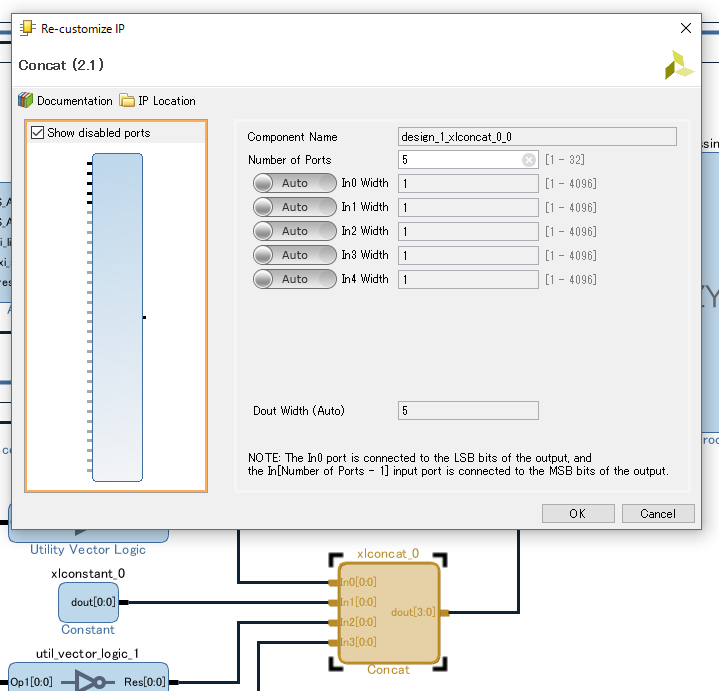 Processing System の IRQ_F2P につながっている xlconcat をダブルクリックして [Numbers of Ports] を 4 から 5 に増やします。 IRQ_F2P ポートの幅はすぐには反映されませんが、いずれかのタイミングで勝手に広がってくれるので特に編集の必要はありません。