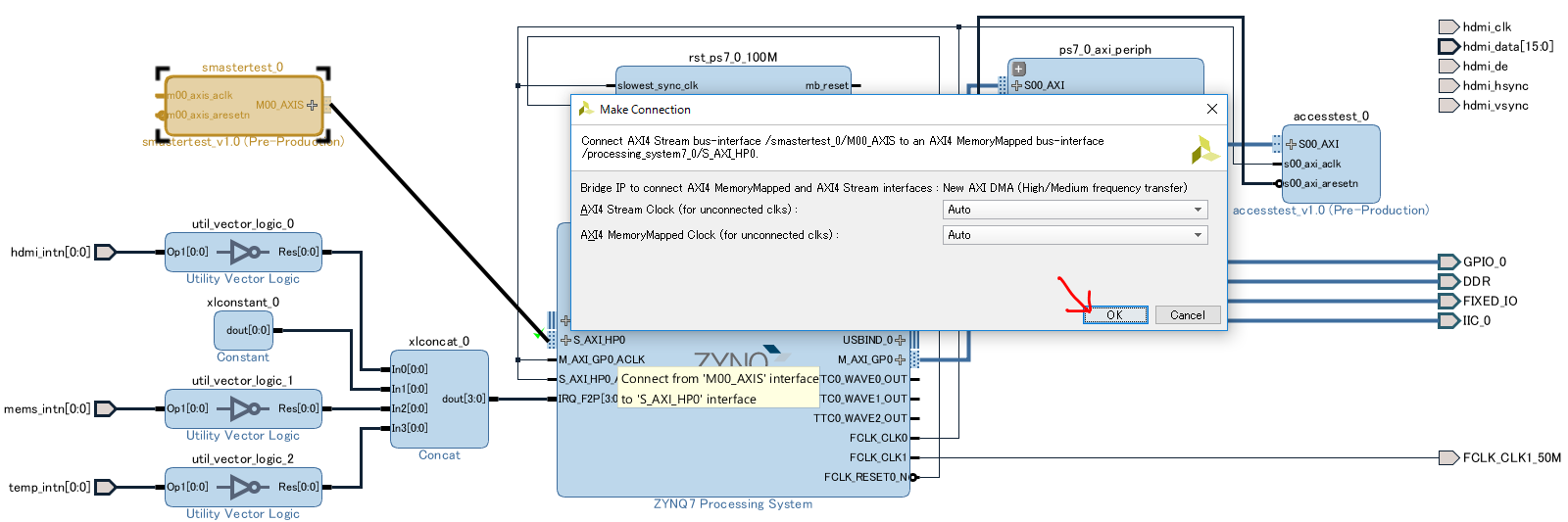 デザインに追加し、M00_AXIS ポートから S_AXI_HP0 へドラッグし線で結ぶと、 直接はつなげないので DMA コントローラを追加して良いか、と聞かれます。