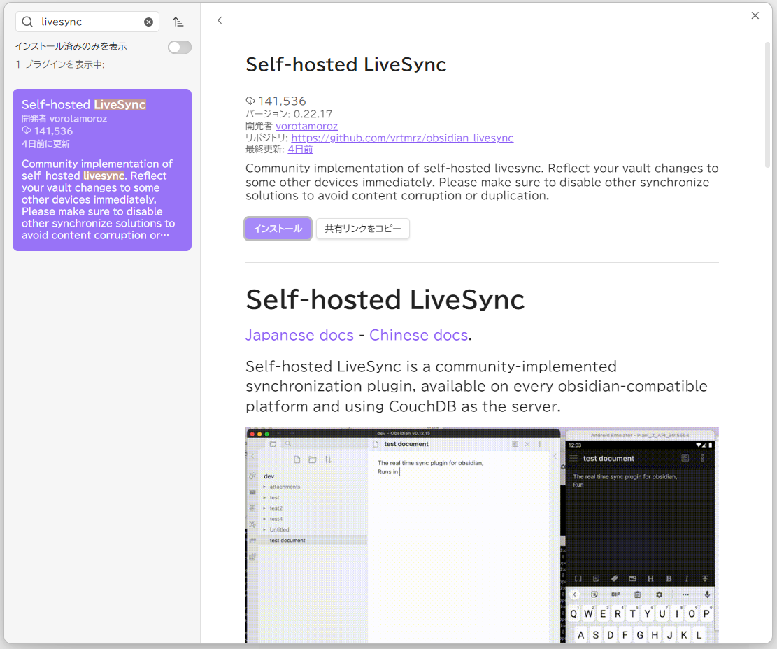 検索ボックスで livesync を検索して「インストール」