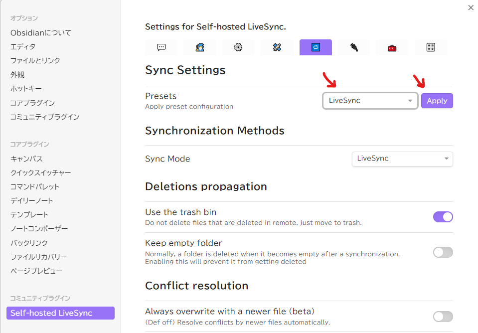 Sync Settings の Presets で LiveSync を選択して Apply