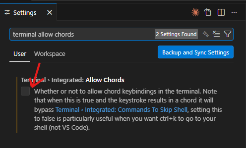 実はこの挙動は設定で変更できて、「Allow Chords」のチェックを外す(falseにする)とターミナルのキーバインドが有効になり、Ctrl + kでカーソルの後ろの文字を削除できます。設定の説明にわざわざCtrl + kの話が書いてあるあたり、この件はみんな同じことを考えているのでしょう。