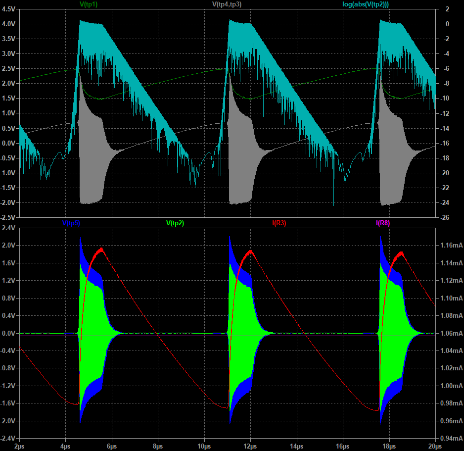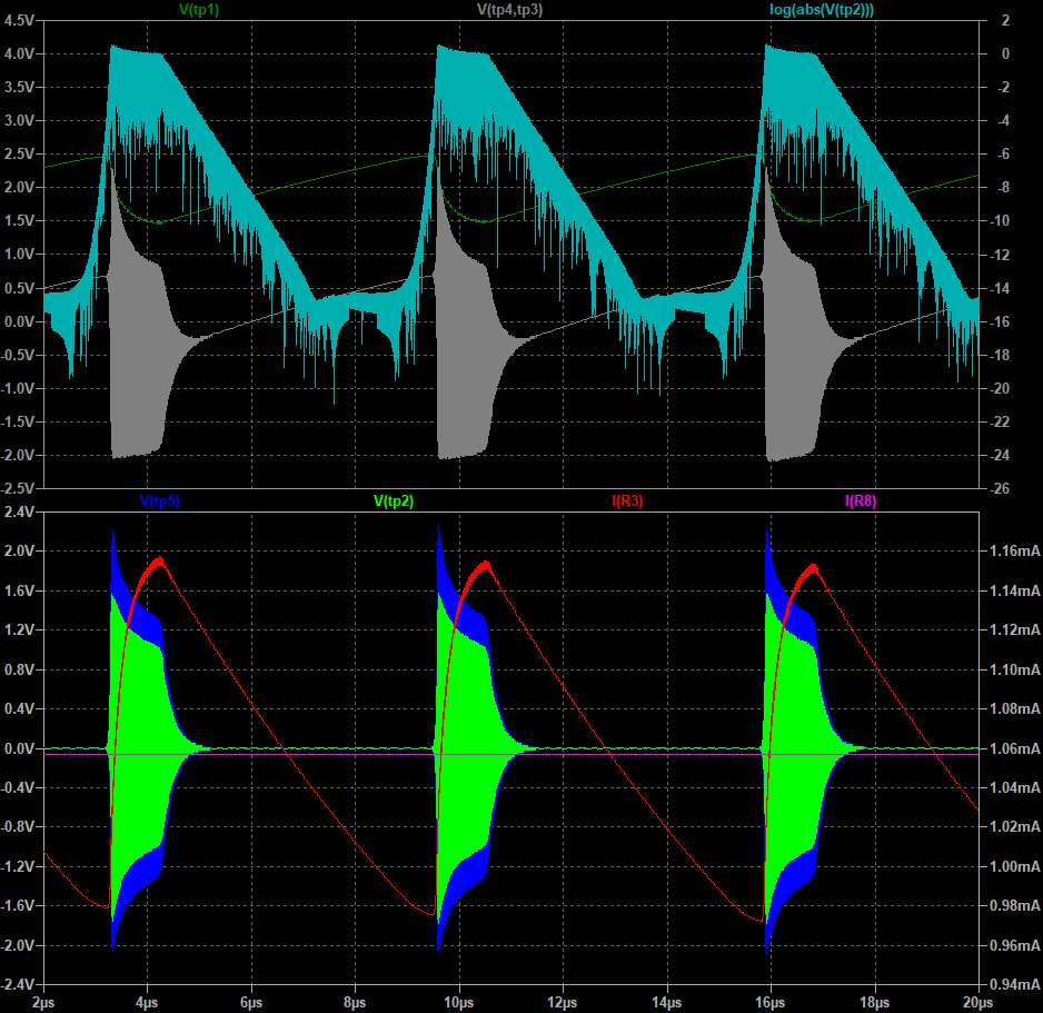 1. や 4. における振幅の変化を見やすくするために、振幅をログスケールに直したのが 上段の log(abs(V(tp2))) である。tp5 の電圧には低周波の揺らぎがあって、そのまま log を取ると見づらかったのでハイパスフィルターをかけて高周波成分のみを取り出したのが tp2 だ。 その際に少々振幅が低下してしまっているけれどまあここではあまり気にしなくて大丈夫。