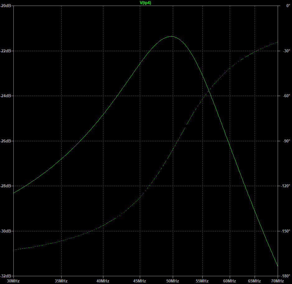 アンテナ入力から tp4 への AC 伝達特性をグラフにすると、 50MHz で緩やかなピークを取ることを確認できる。