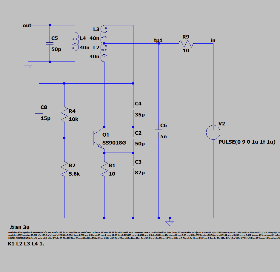 発振回路の詳細としては、 Q1 のコレクタに流れる電流値を L2、L3 経由で Q1 のゲートに ポジティブフィードバックしているのだと思うけれど、 発振周波数がどこで決まっているのかなど、まだよく理解できていない。