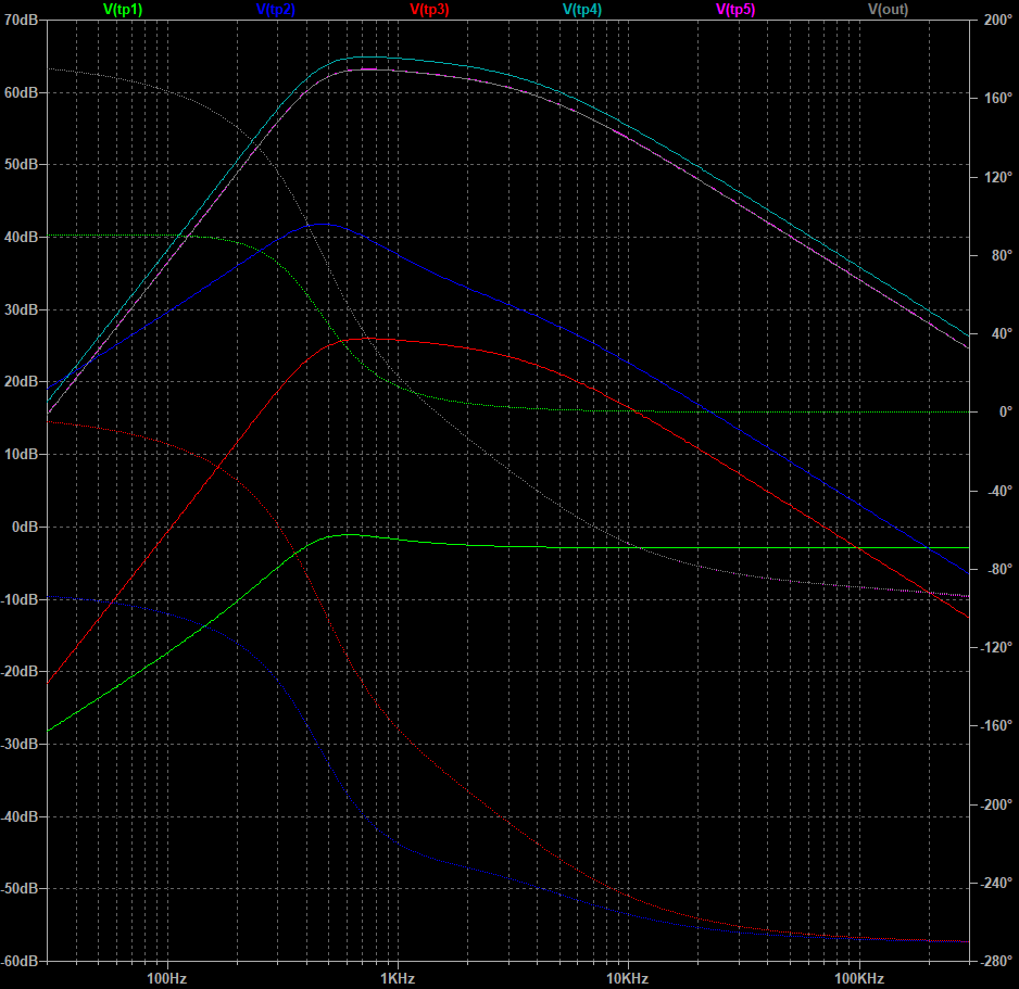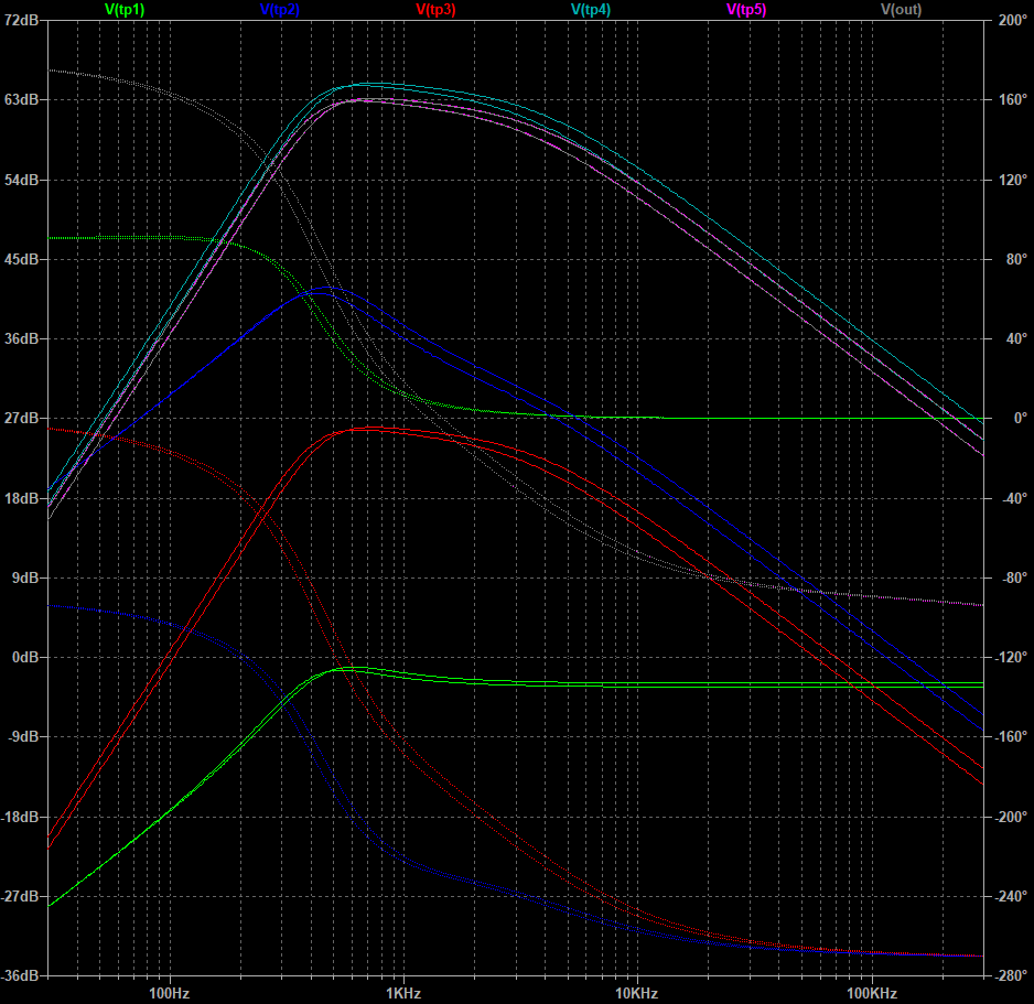 結果的に、400Hz - 5kHz くらいの中音域に帯域を持つ 60dB オーバーの低周波増幅器となっている。