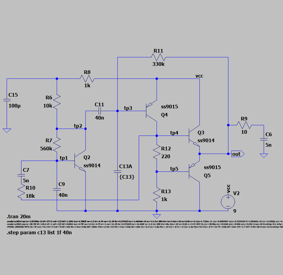 そのせいで V(tp2) = 560k x Ib + 0.62V = 1.6V 程度になる。この値と 0.62V との差で振幅の最大値が決まる?