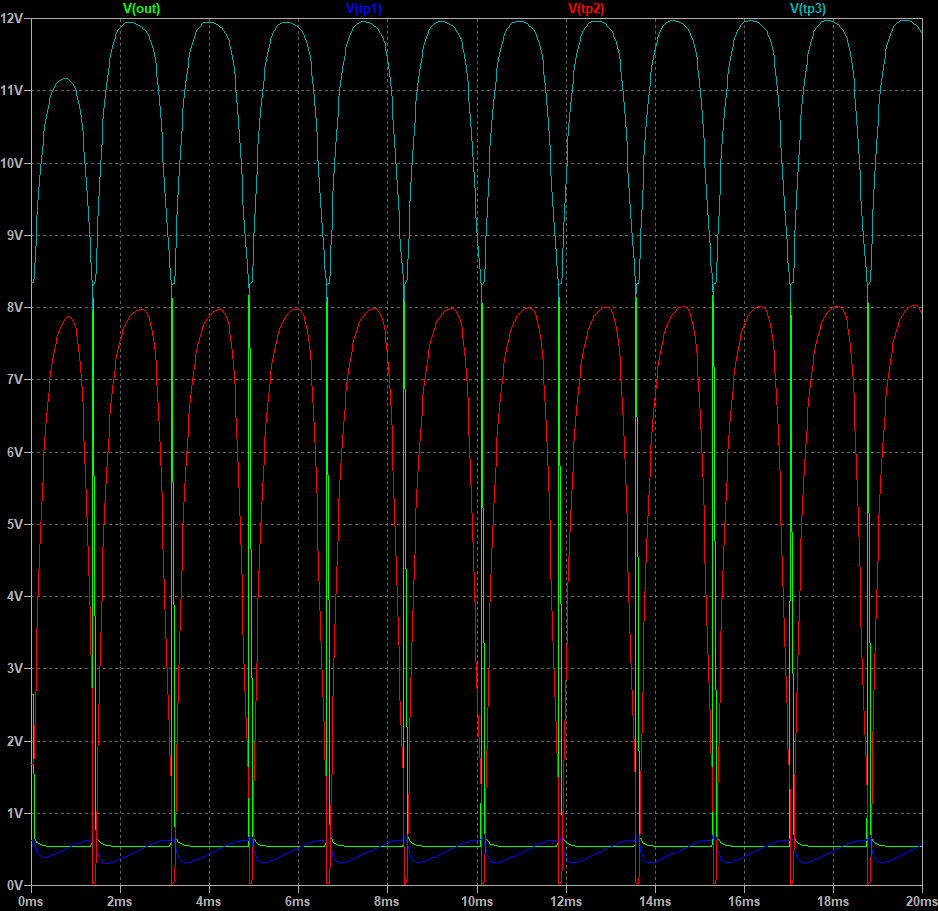これは、I(R8) の変化に応じて電源電圧 V(tp1) が上下し、それに伴い Q1 へのバイアス電圧 V(tp4, tp3) が上下して、Q1 の増幅動作が停止・開始を繰り返すことに対応している。