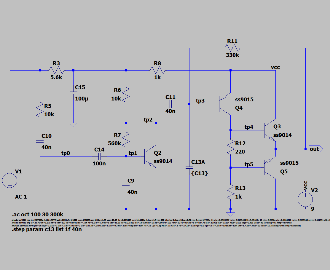 - 出力から R11 で負帰還がかかっているが、40nF と 330kΩ だとカットオフが 12Hz くらいになるので、これは DC レベルを決めるための負帰還で、AC 的には帰還はないと思って良さそう