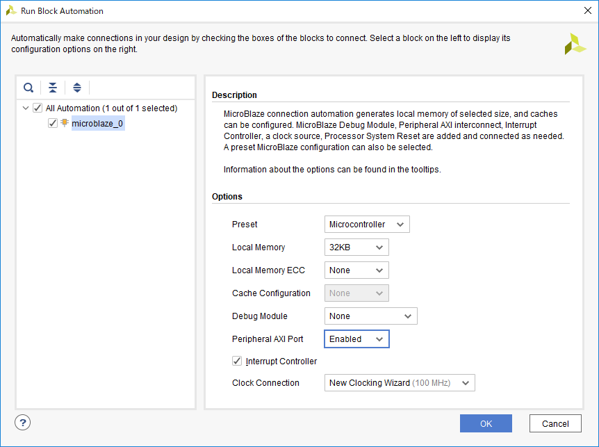 上部の Run Block Automation を押し、MicroBlaze についていろいろ設定する