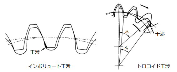 - インボリュート曲線部分のみで歯形としているため歯数の少ない場合に歯先円まで届かない(実質的な歯先円が大きくなる)