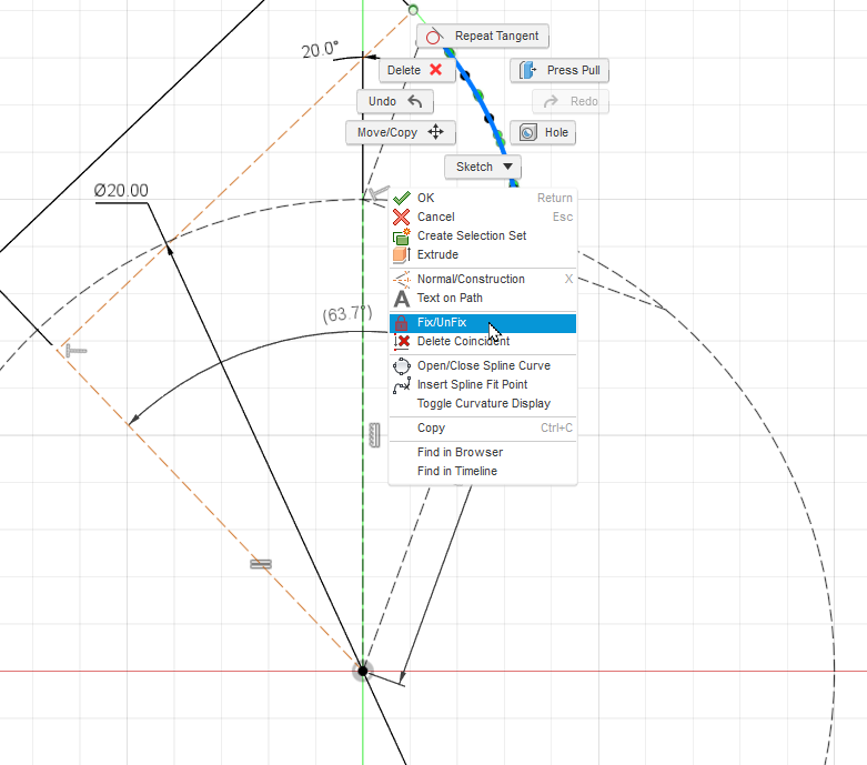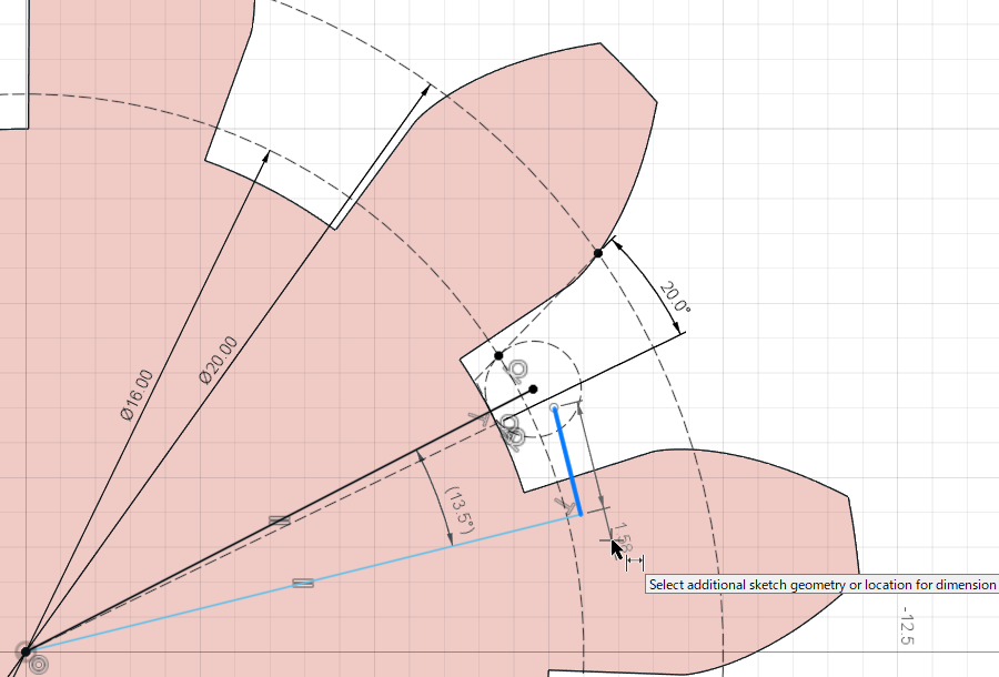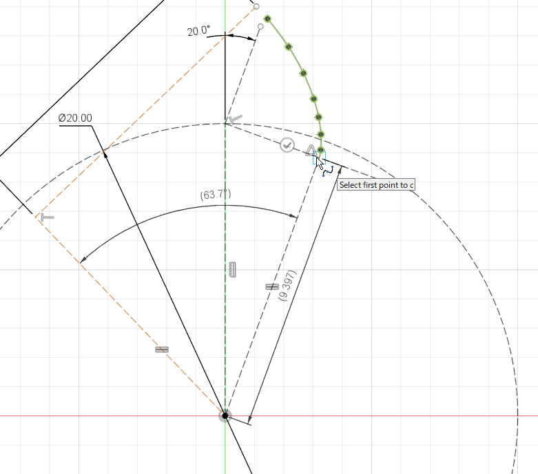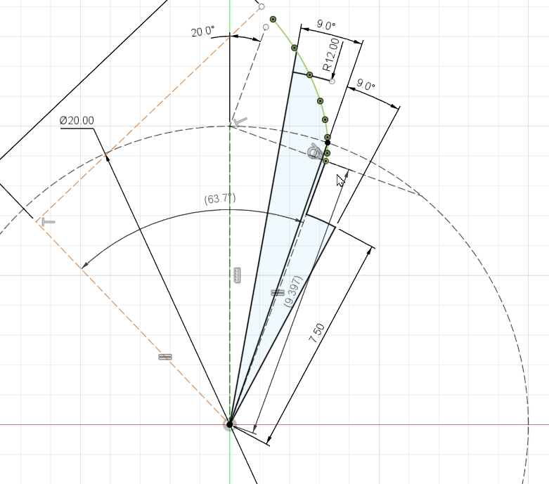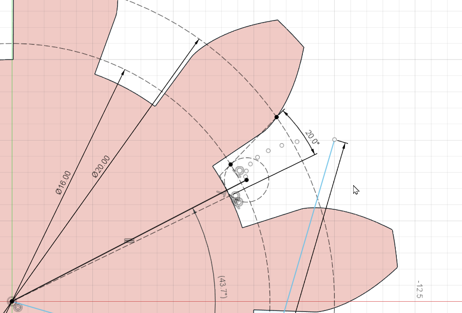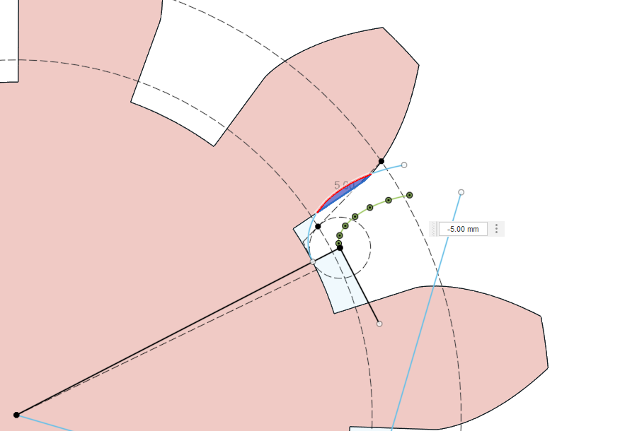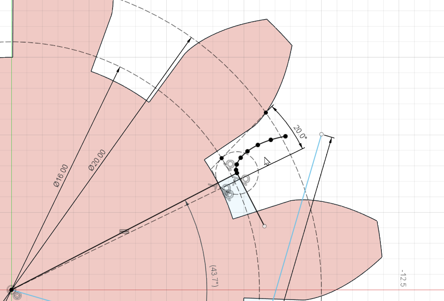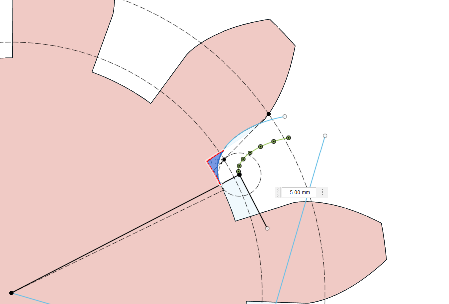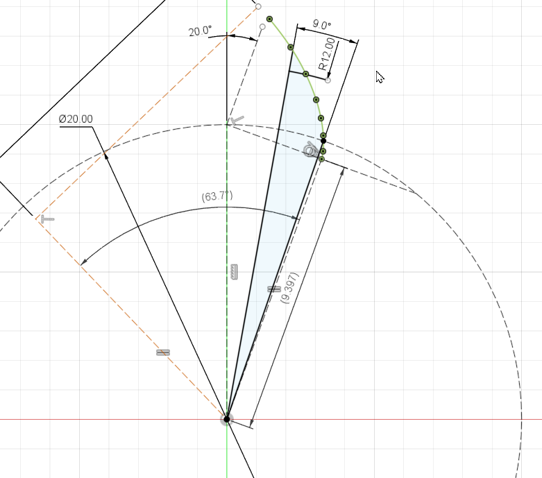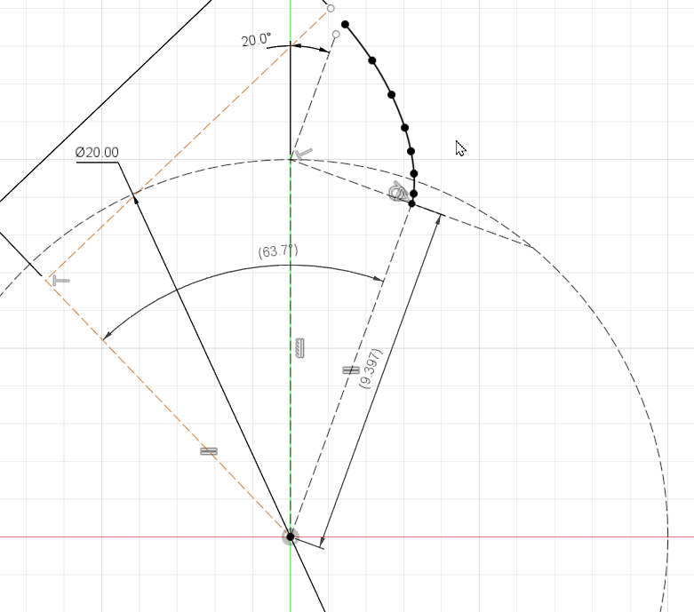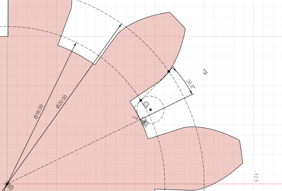 - 角度を従属パラメータとしてあるため、2つ目の半径をマウスカーソルでドラッグすると直線の端点がインボリュート曲線上を移動する