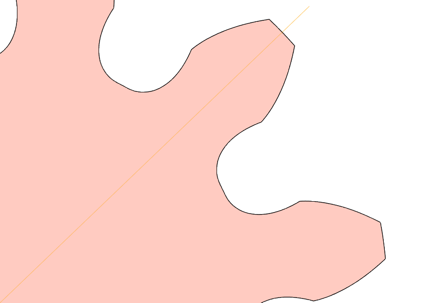 このように、適当な回転角を設定した際の歯形状の点を1点求められれば、 徐々にパラメータを変えて点を置いて行き、最後にスプラインで結ぶことで曲線が得られる。