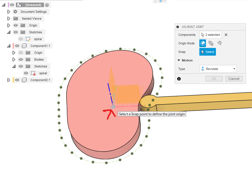 カムコンポーネントとルートコンポーネントとを選択して、両者の間に構築済みジョイント(回転)を原点位置に作成します。
