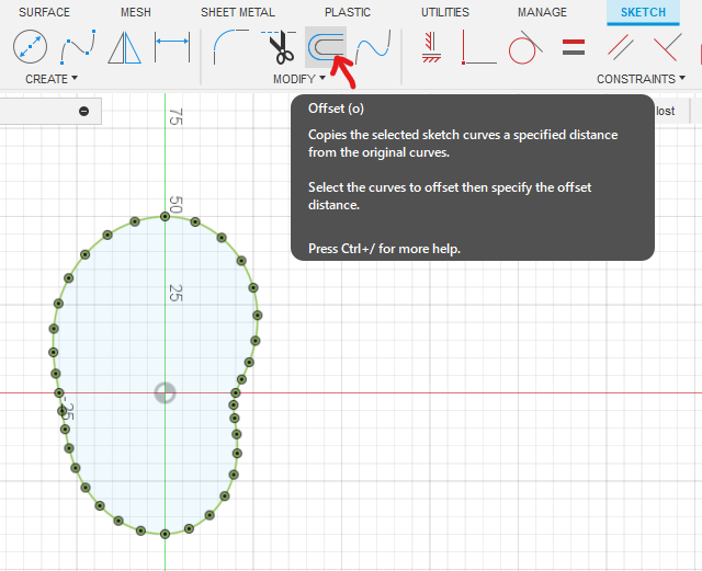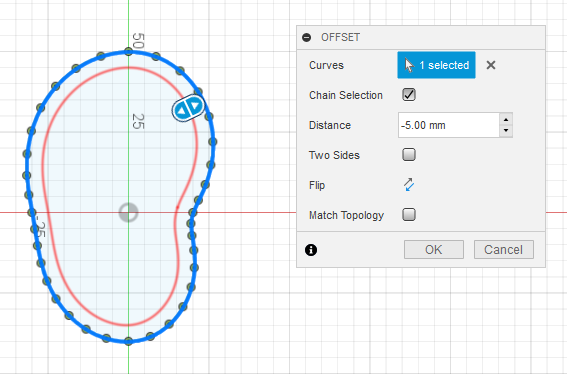 オフセット機能を使い 5 mm だけ内側へオフセットした形状を生成します。
