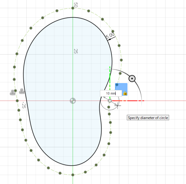 上でオフセットに使ったのと合わせて半径 5 mm、直径 10 mm の円を描きます。