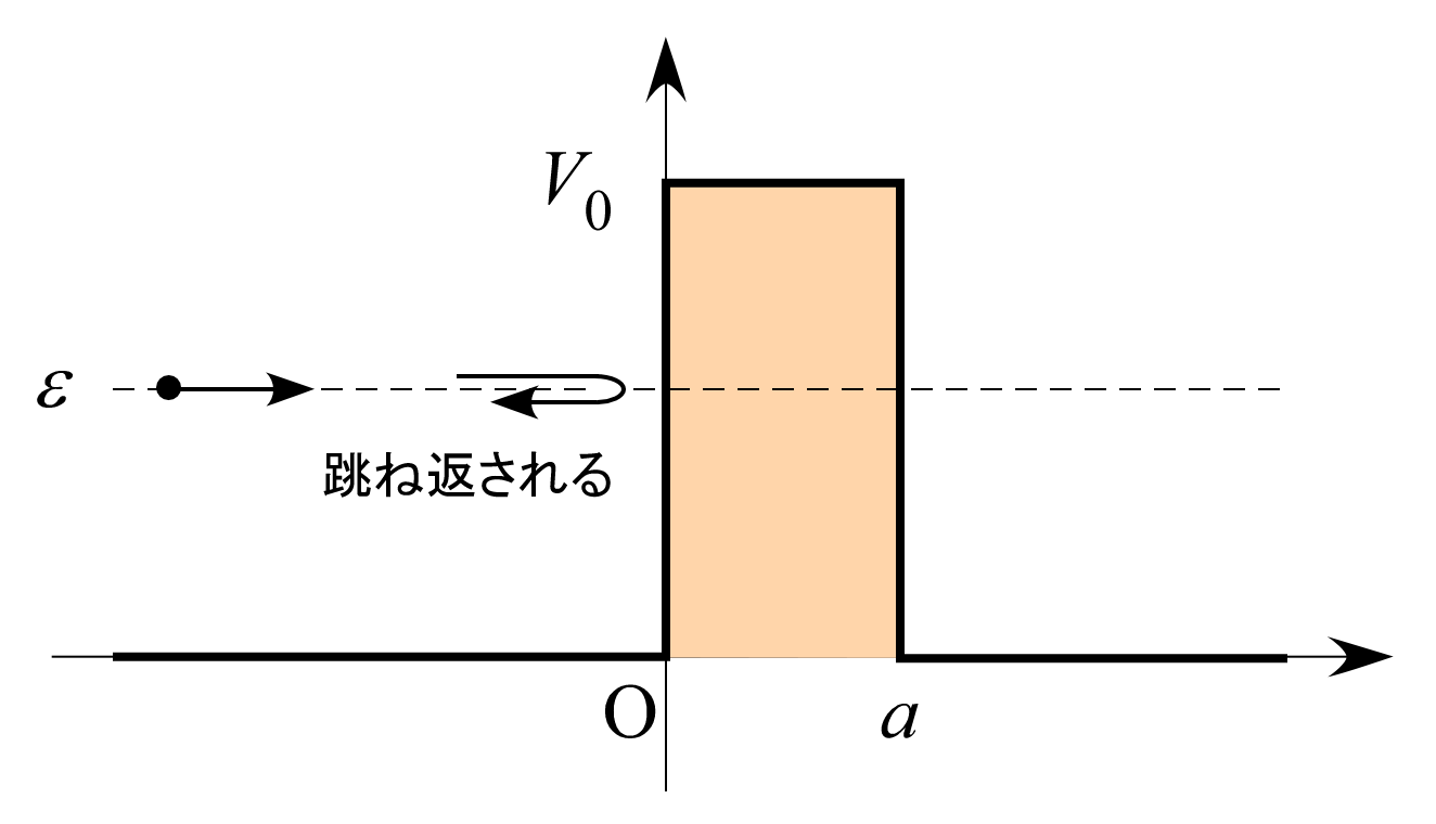 古典論ではこのような障壁は完全弾性障壁とみなせ、 入射方向と逆方向に入射時と同じ大きさの運動量を持って跳ね返される。