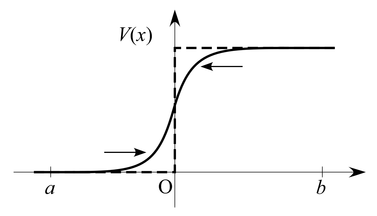 ただし、上記の箱型障壁の端点ように が 不連続に変化する点 では、 この限りではない。このことを見るために、 が の範囲で連続に、 しかし急峻に変化する状況を考察する。