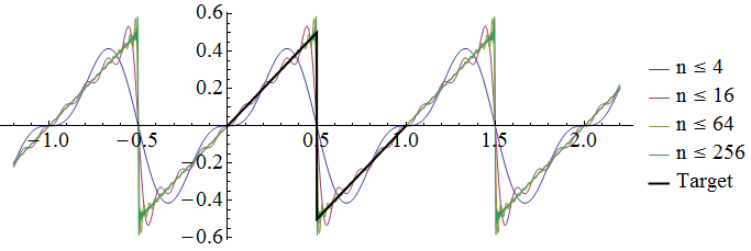 (3) の与式は下図で Target として示したように に不連続点を持つが、 このような関数に対しても上記の無限級数は収束する。