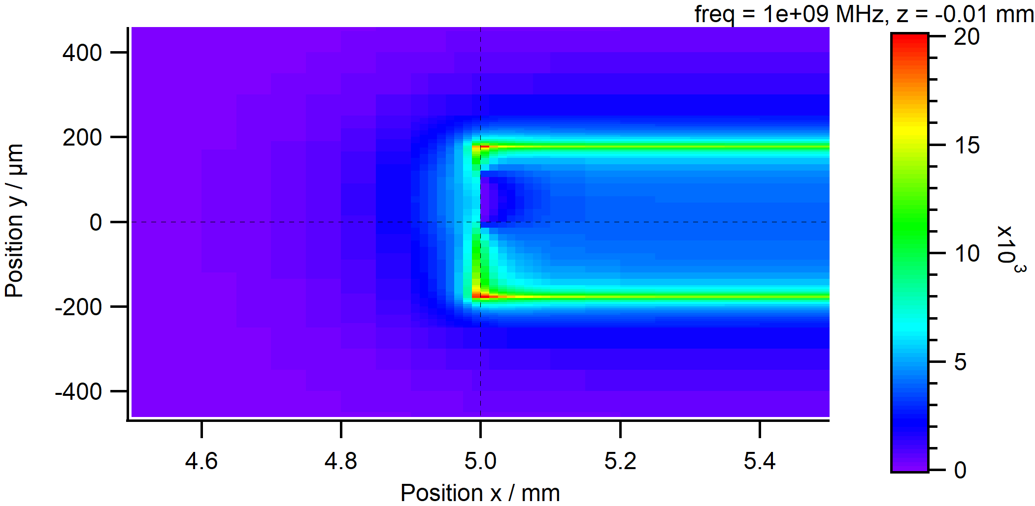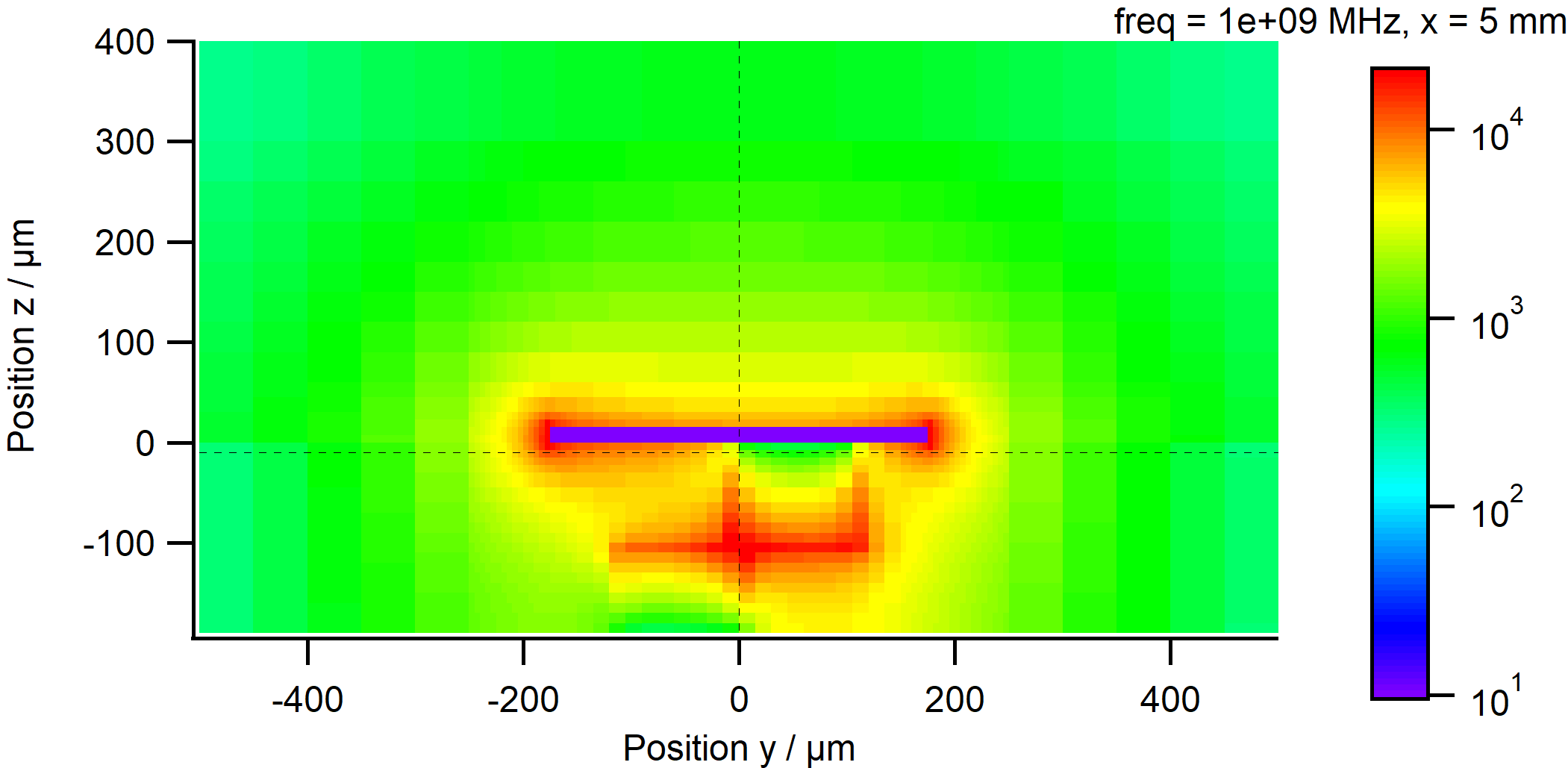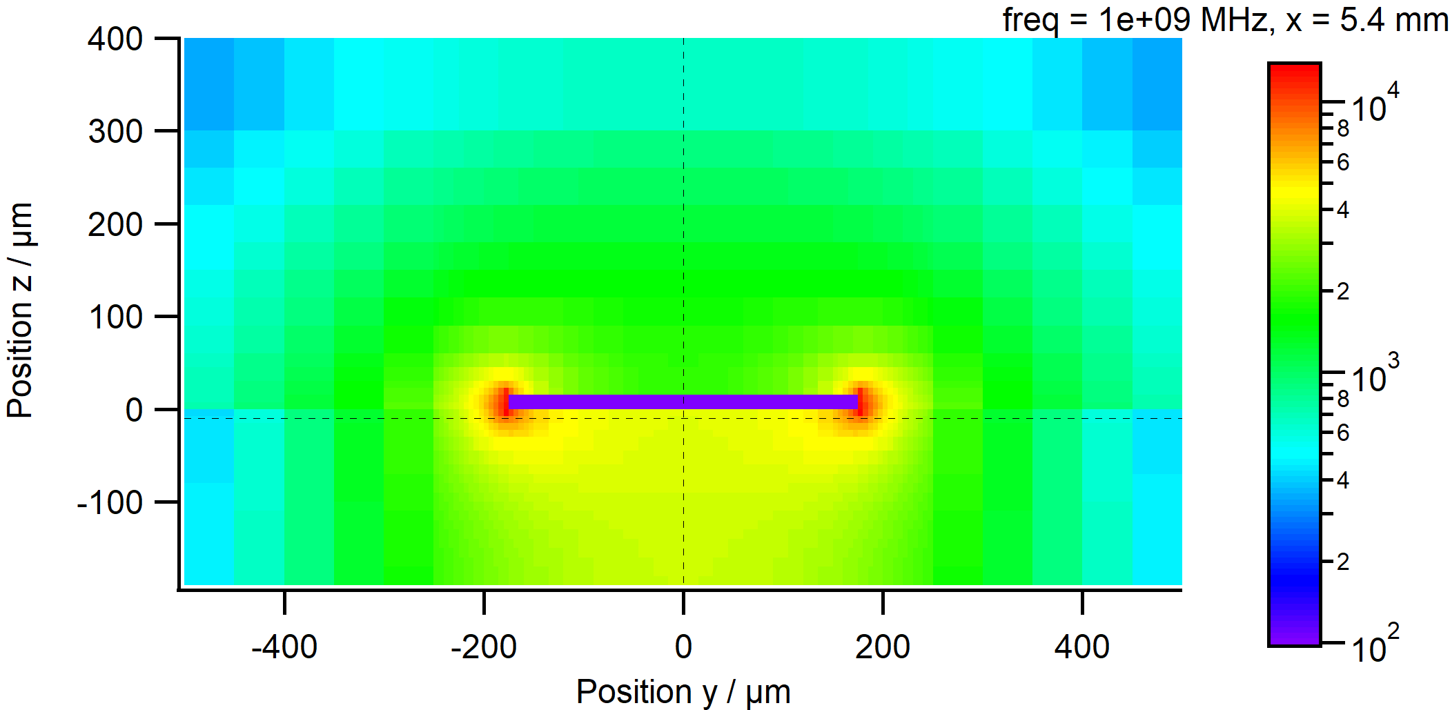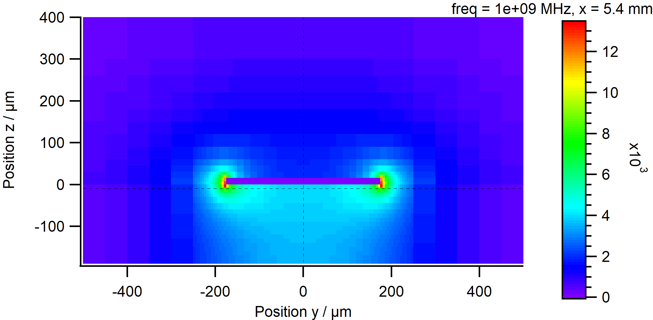 断面に沿った電場の分布はこんな感じ。