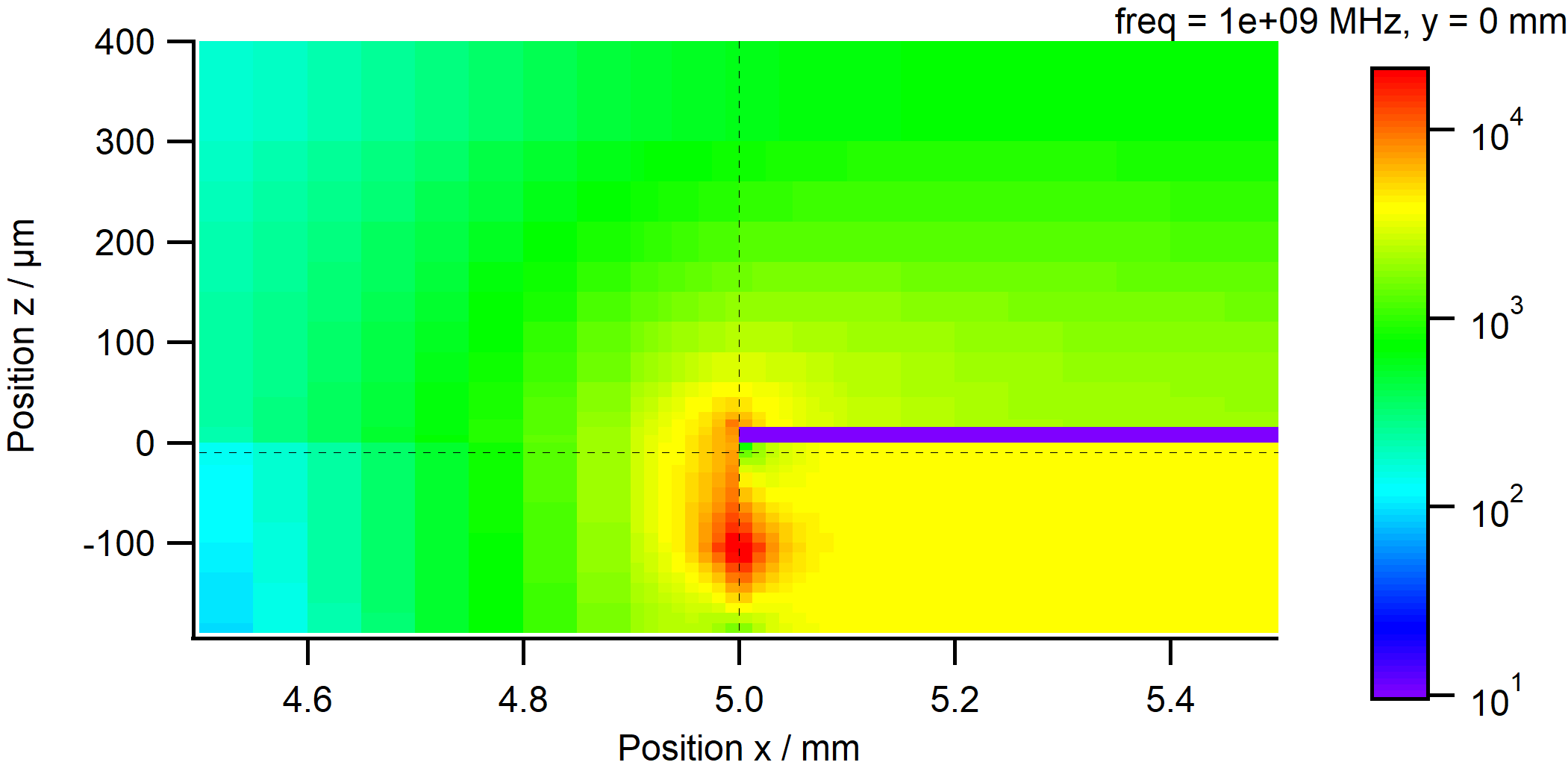 左はログスケール、右はリニアスケール。特にリニアで表示すると、電場がトレースの角の部分に局在していることが分かる。この部分のメッシュを細かく切らないと入力インピーダンスは低下して見えるようだ。これは実質的に線が太くなっているということなのかもしれない。