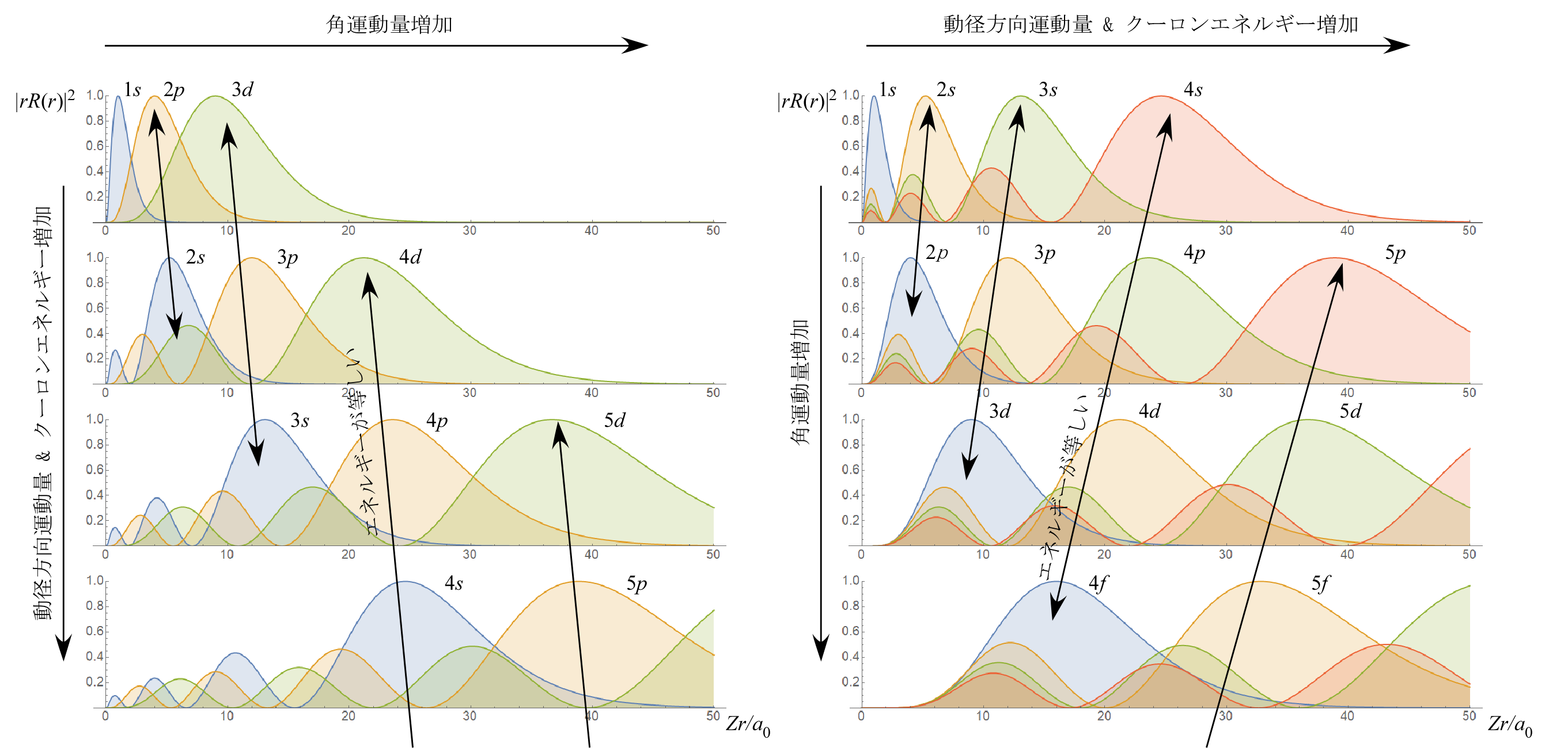 そこで、山の数が同じもの( 方向の運動量が同じもの)同士で比べれば、 が大きくなるほど外側へシフトする、という期待通りの結果になっている。 同様に、同じ角運動量を持つ状態同士を比べれば、$r$ 方向の運動量が大きくなるに伴い、$r$ 方向の「振幅」が大きくなるために軌道は原子核から遠ざかり、クーロンエネルギーも大きくなることが分かる。